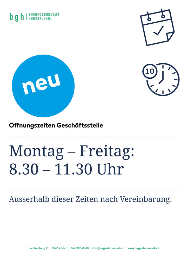 Als präventive Massnahme gegen die Ausbreitung des aktuellen Corona-Virus bleibt der Schalter unserer Geschäftsstelle bis auf Weiteres geschlossen. Die Mitarbeiter*innen der Geschäftsstelle, die Hauswarte und Gärtner sind aber weiterhin für Sie da. Bitte kontaktieren Sie uns per Telefon oder per Mail.